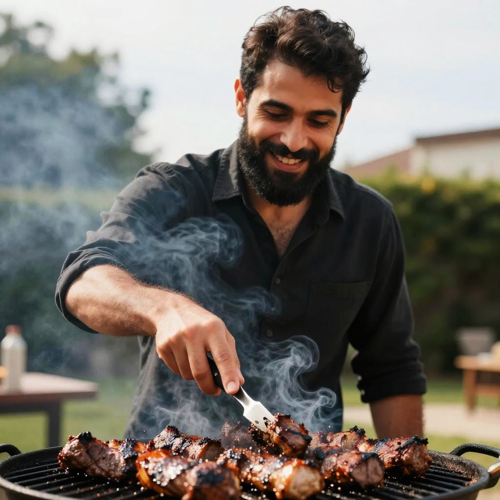 A photograph of a smiling, bearded man with short dark hair, wearing a black shirt, tending to a grill outdoors. He's reaching forward with his right hand, flipping juicy, grilled meats. The background is blurred with green foliage and a bright sky. The grill emits a small cloud of smoke. The image has a vibrant, slightly exaggerated color style.