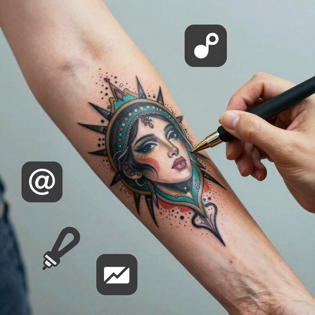 Photograph of a tattoo artist inking a vibrant, detailed portrait of a woman with a crown on a forearm, with tattoo design elements and app icons