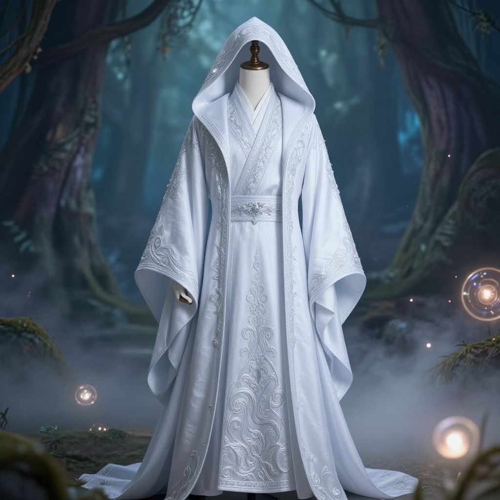 Photograph of a white, intricately embroidered robe with a hood, displayed on a mannequin in a mystical forest setting. The robe features ornate, swirling patterns and a satin-like texture. The hood is slightly open, revealing the mannequin's headless, black face. The background is a dimly lit forest with blue and green hues, large trees, and soft mist. Glowing orbs and small lights float in the air, adding a magical ambiance. The robe's long sleeves and flowing bottom add a sense of elegance and mystery to the scene.