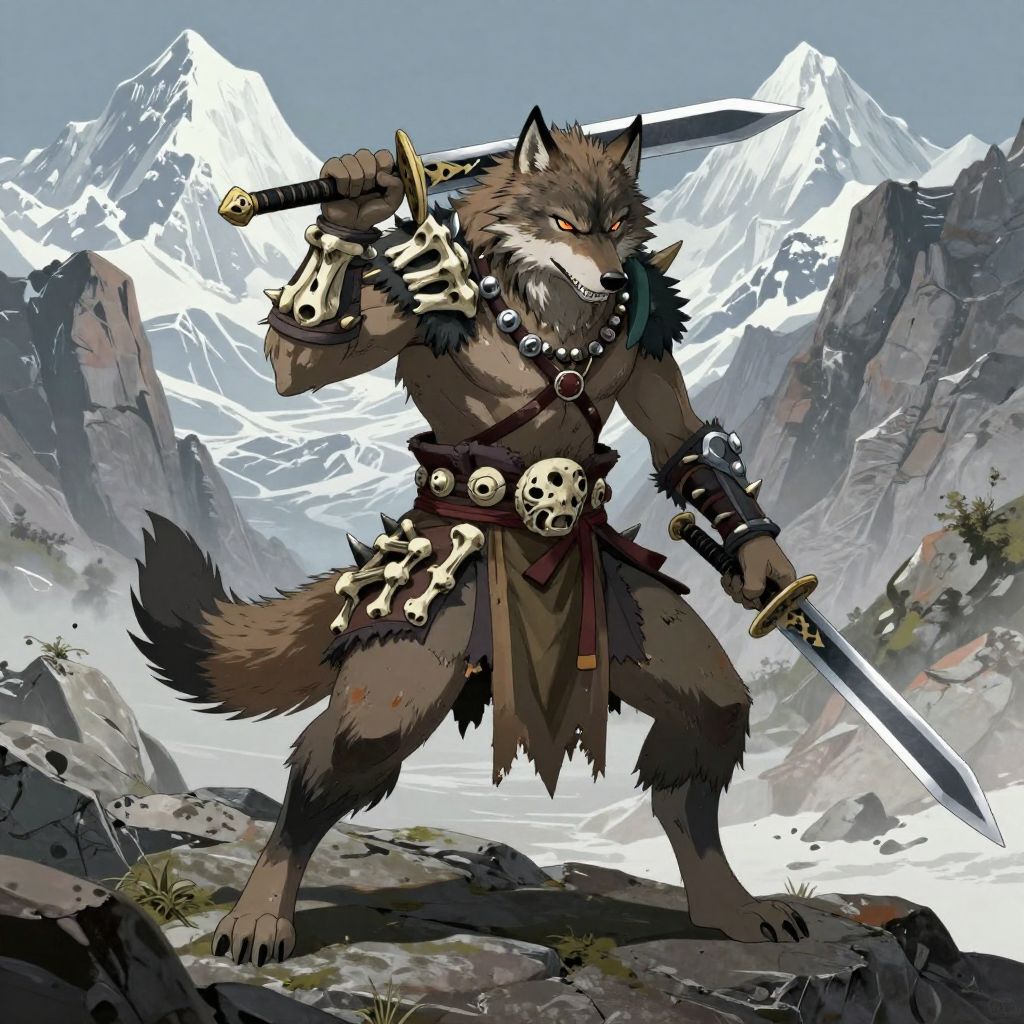 Digital art of a fierce, anthropomorphic wolf warrior with bones and skulls in armor, wielding swords, standing in a snowy mountain landscape.