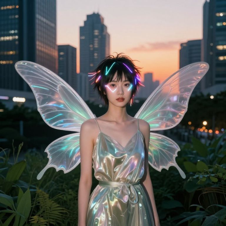 Photograph of an East Asian woman with short, black, neon-accented hair, wearing a shiny, silver, V-neck dress and translucent, iridescent fairy wings. Her face is illuminated with a glowing fairy light effect. The background features a cityscape at dusk with tall buildings and a pink-orange sunset. The woman stands in a dark, foliage-filled area, creating a contrast with her luminous appearance. The image combines elements of fantasy and realism, with a focus on the ethereal, neon glow against the urban setting.