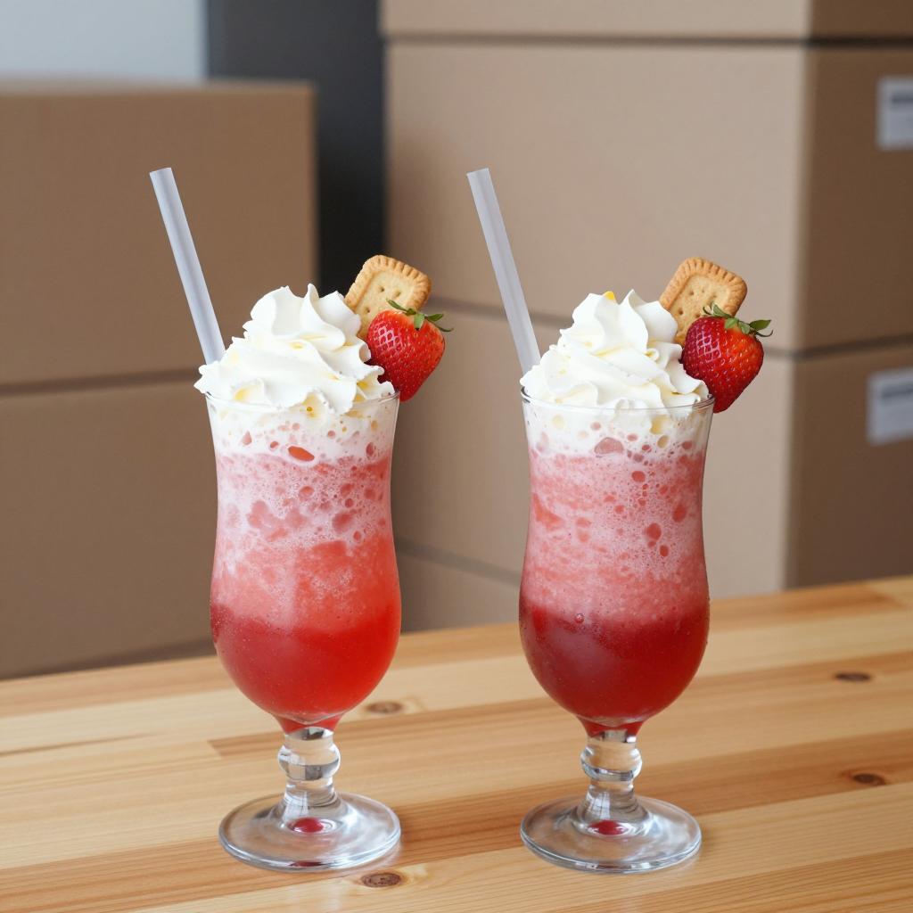 Two tall, gradient red to pink frozen drinks in goblet glasses on a wooden table. Each drink has whipped cream, a cookie on top, and a strawberry. Background has stacked cardboard boxes. Drinks have silver bases. Plastic straws in drinks.