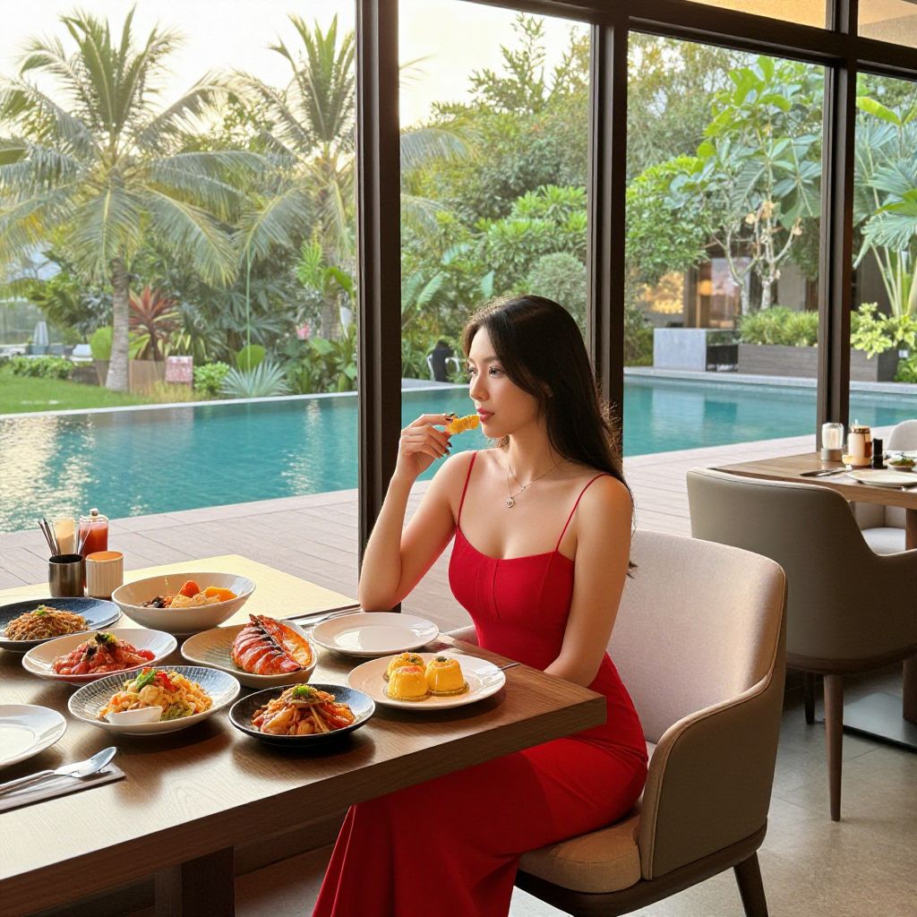 A woman in a vibrant red dress sits elegantly at a wooden table adorned with a colorful array of dishes, basking in the warm, golden-hour lighting of a modern restaurant by a large window that offers a serene view of a tranquil pool and lush greenery beyond.