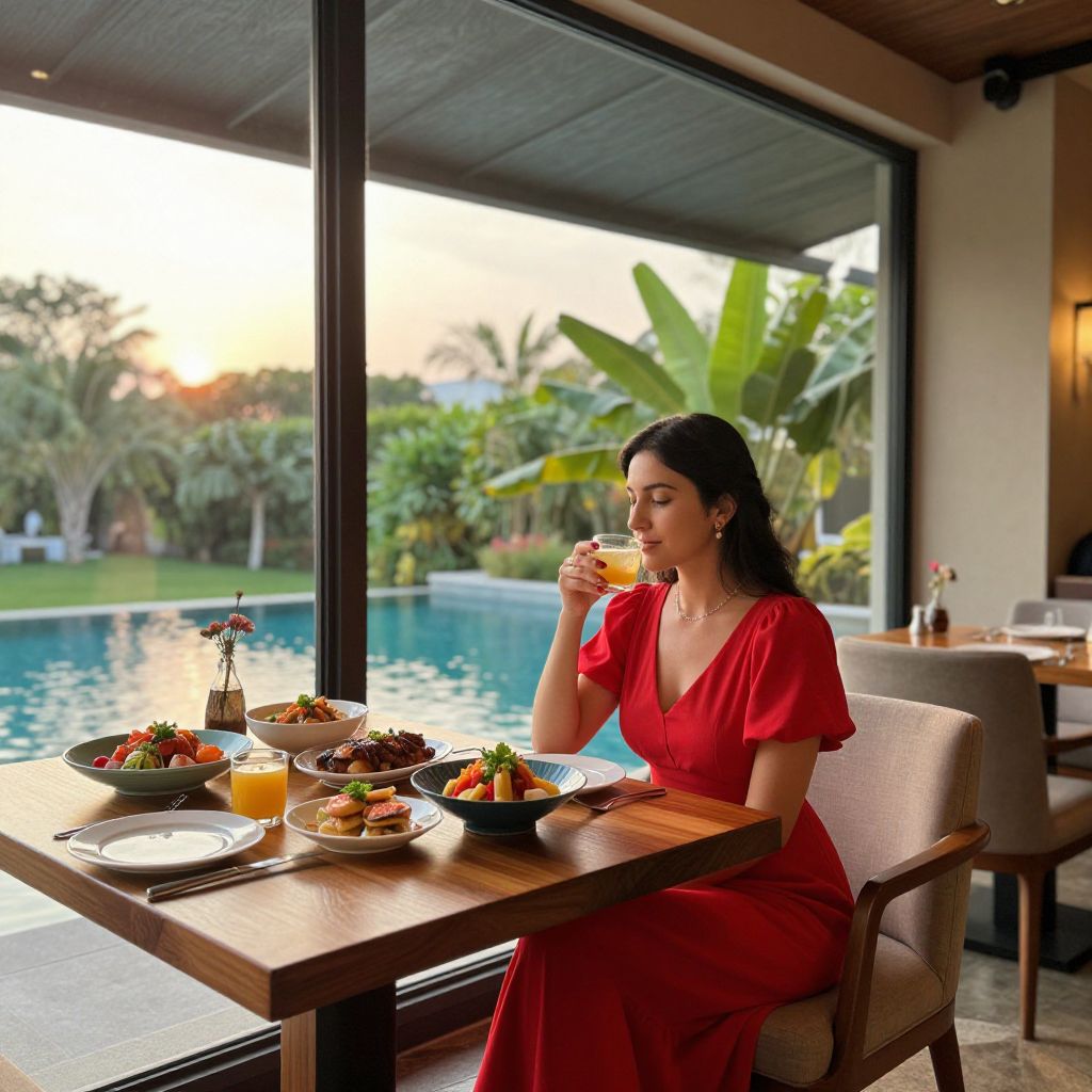 Photograph of a woman with medium-length dark hair, wearing a red, short-sleeved dress, sitting at a wooden table by a large glass window. She is sipping from a glass of orange juice, with a serene expression. The table has a plate of salad, a bowl of fruit, and a glass of orange juice. Outside, a clear blue swimming pool is visible, surrounded by lush greenery and palm trees. The setting is modern and elegant, with warm lighting and a cozy indoor-outdoor dining area. The background includes a sunset sky and a wooden ceiling.