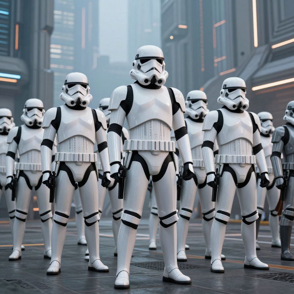 Female character from star wars is wearing a white hoodie with brown sleeves and a brown belt. She has a white helmet on her head and is standing in a crowd of people.