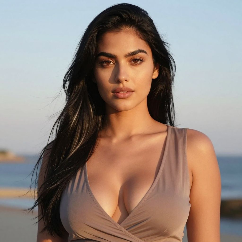 Photograph of a young woman with long, dark, wavy hair and olive skin, standing on a beach at sunset. She has full eyebrows, dark brown eyes, and slightly parted lips. She wears a low-cut, beige, sleeveless top that reveals ample cleavage. The background shows a blurred ocean and clear sky with soft, warm light. Her expression is neutral, and the lighting highlights her facial features and hair. The overall mood is serene and natural.