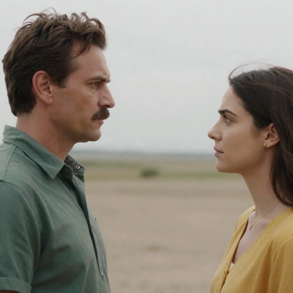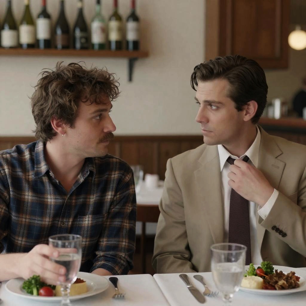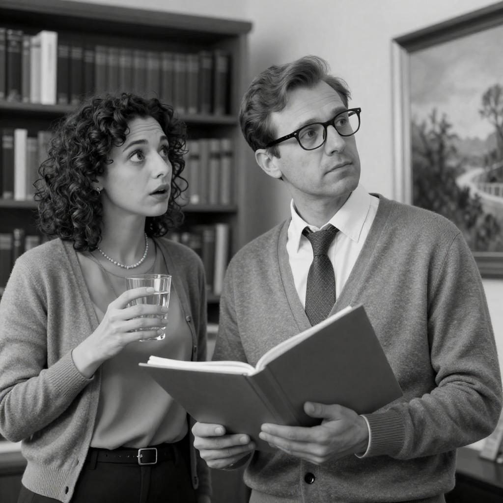 Photograph of two people at an outdoor table. A woman with curly brown hair in a pink sleeveless top holds a teacup, looking at a man in a brown plaid suit with a striped tie. He has glasses and a mustache, looking at her. Tea set, books, and fountain in the background. Woman's expression is intense, man's is neutral. Wicker chairs, greenery, and statues in the background.
