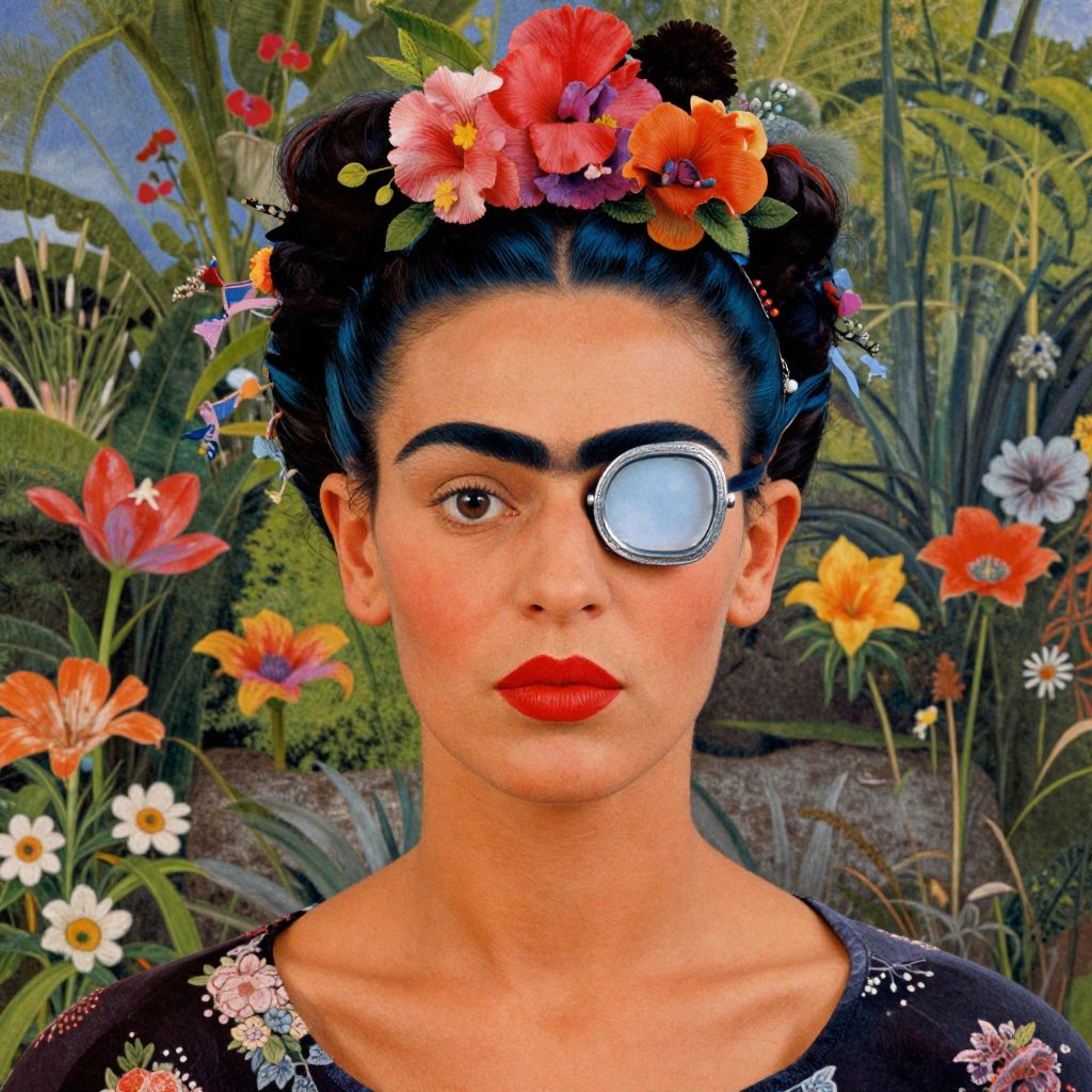 Craft an image that embodies the dynamic and expressive nature of Kahlo's self-portraits, portraying a close-up perspective of a woman with mesmerizing blue hair and vivid red lips. She is adorned with a lavish, intricately designed floral crown that flows gracefully down her back. One eye is wide open, revealing her captivating gaze, while the other is concealed behind an elegant silver monocle. The background features a verdant, overgrown garden filled with exotic blooms, their vibrant petals seamlessly integrating with her attire. This detailed digital artwork should convey an emotional spectrum that harmoniously balances the subject's boldness and vulnerability, capturing Kahlo's distinctive fusion of Mexican folk art and surrealism in a captivating composition.