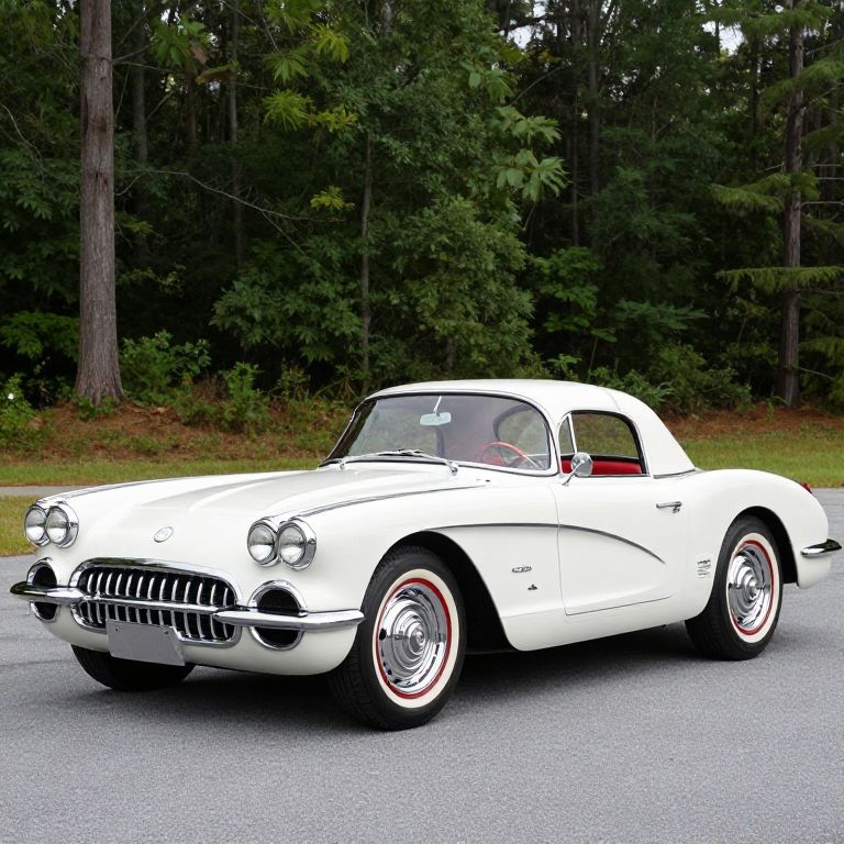 Photograph of a classic white 1950s convertible sports car with a sleek, rounded design and chrome accents. The car features red-painted wheels and a polished chrome grille. Its black-tinted windows and red interior are visible through the open top. The car is parked on a gray asphalt road, with a dense forest of tall, green pine trees in the background. The car's headlights are round and prominent, and the front bumper is chrome. The overall scene has a nostalgic, vintage feel, highlighting the car's elegant and timeless design.