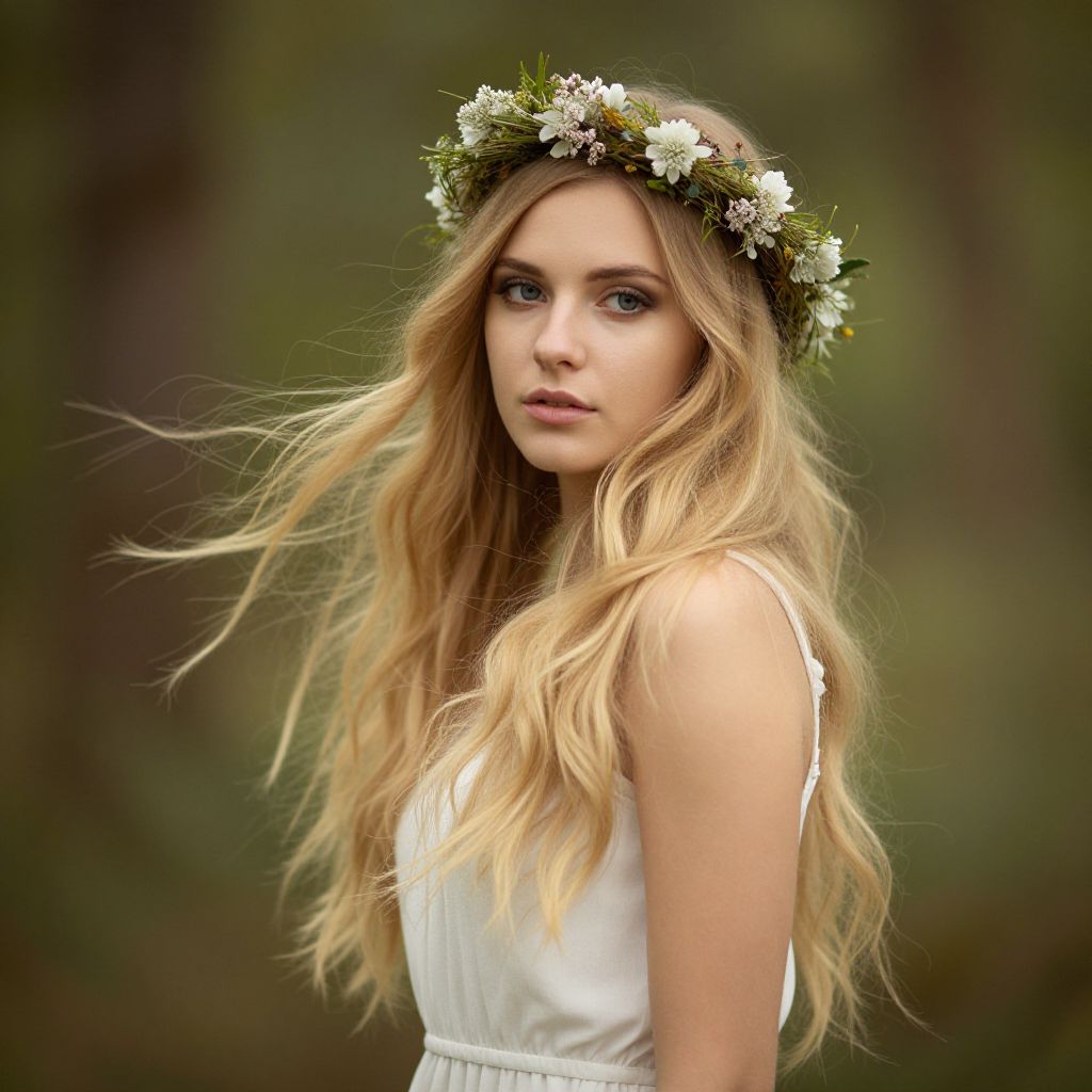 A serene portrait of a young woman with flowing blonde hair adorned with a floral crown. She stands amidst a tranquil forest, exuding a dreamy quality that captures the essence of nature and beauty.