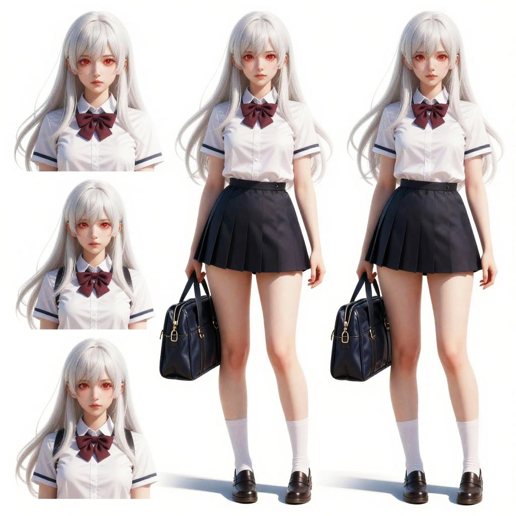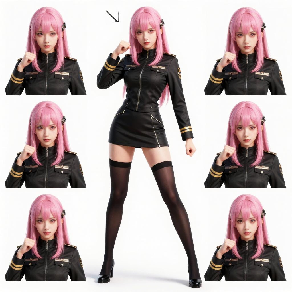 (CharacterSheet:1), 1girl, (straight pink hair, long hair, hair clip, black uniform, black thighhighs, skinny, pilot jacket), (aviator uniform, military), fight pose, (multiple views, full body, upper body, reference sheet:1), (simple background, white background), (masterpiece:1.2), (best quality, highest quality), (ultra detailed), (8k, 4k, intricate), (full-body-shot), (Cowboy-shot:1.4), (50mm), (highly detailed:1.2), (detailed face:1.2), detailed_eyes, (gradients), (ambient light:1.3), (cinematic composition:1.3), (HDR:1), Accent Lighting, extremely detailed, original, highres, (perfect_anatomy:1.2)