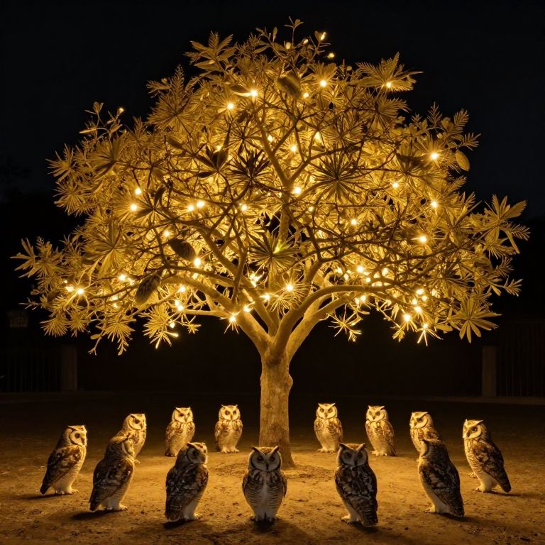 Glowing seedpod tree illuminates a parliament of twelve owls gathered below, their golden eyes reflecting the radiant light as they perch attentively on sandy ground.