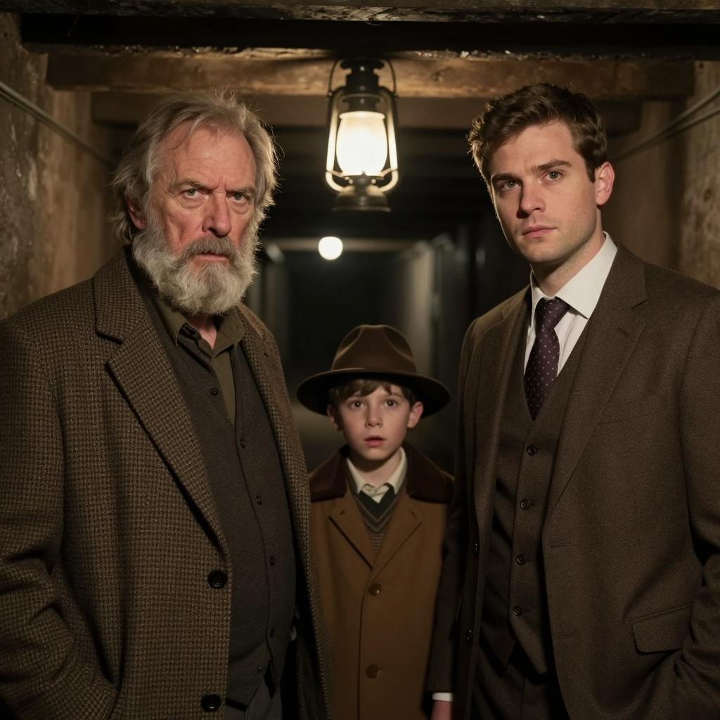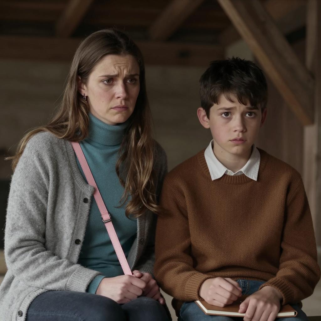 Two boys in a vintage village setting. Young boy with brown hair, red cap, and red sweater sits with chin on hand. Older boy in dark coat, cap, and red sweater stands behind a wooden cart with baskets. Yellow stone houses with windows and signs in background. Older boy's expression is serious. Young boy's expression is neutral.