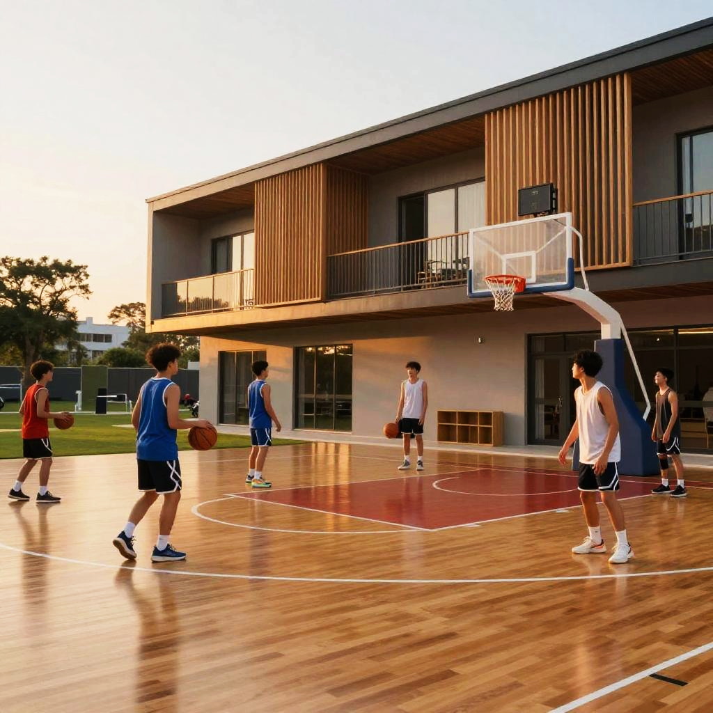 Modern school gym at sunset glow, hardwood floors reflecting warm light, students warming up for basketball games, vibrant colors, sporty atmosphere, modern architecture with metal and wood accents