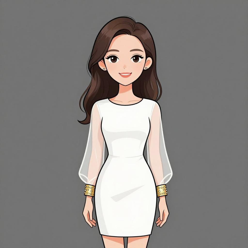 Woman with pretty face and pretty hair. smiling Woman, minimalist, simple shift dress in solid white, long sheer sleeves, round neckline, thigh-length hem, gold embellished cuffs. --sref 1467