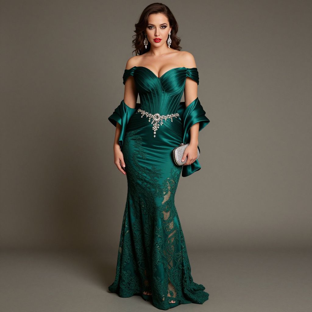 Photograph of a curvy woman with fair skin and dark, wavy hair wearing a floor-length, off-the-shoulder, emerald green lace gown. The dress features a sweetheart neckline, ruffled sleeves, and intricate lace detailing on the lower half. She accessorizes with large, dangling silver earrings and holds a white, oval-shaped clutch. Her makeup is bold with red lipstick. The background is a plain, gradient gray. She stands confidently, looking directly at the camera. The overall style is elegant and glamorous, suitable for a formal event.