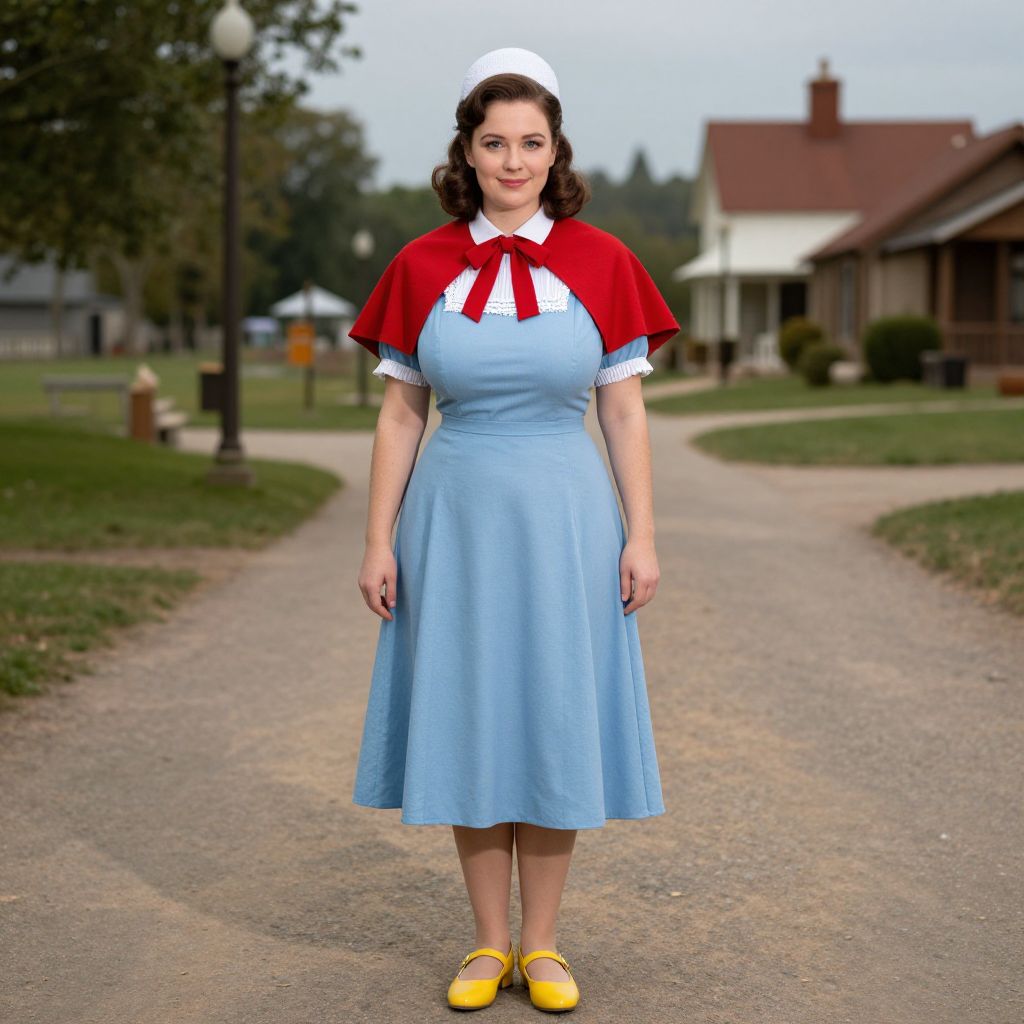 Photorealistic CGI of a smiling woman in a blue pinafore dress, red cape, white apron, yellow shoes, standing on a suburban