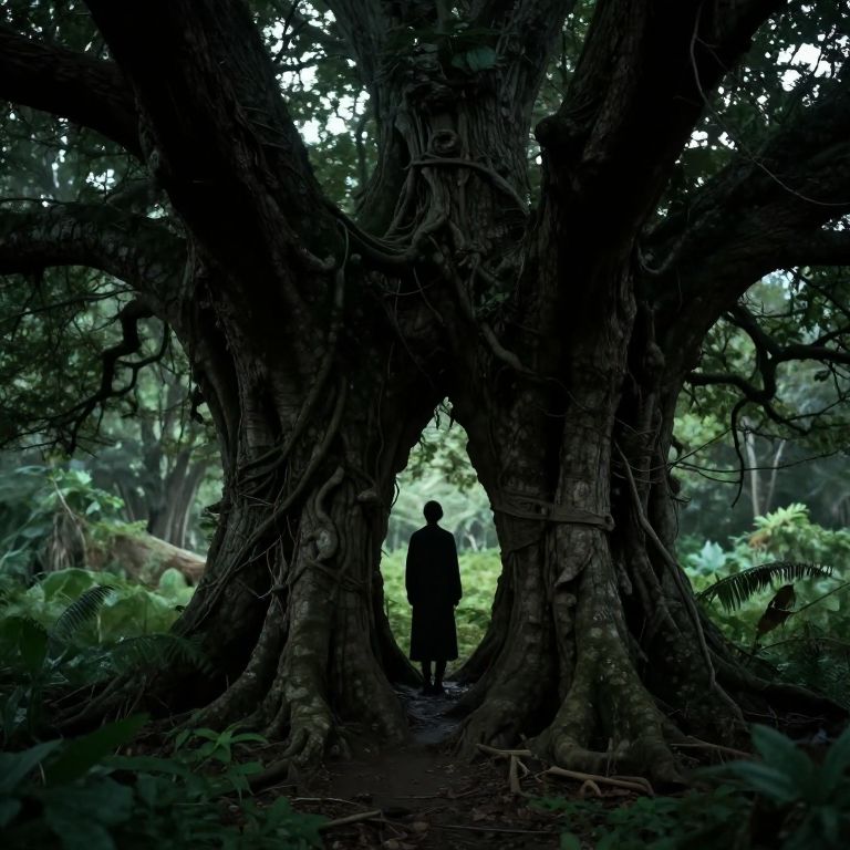 A solitary figure stands within the hollowed embrace of an ancient, sentient tree, its gnarled roots and branches forming a mystical portal to an unseen world.
