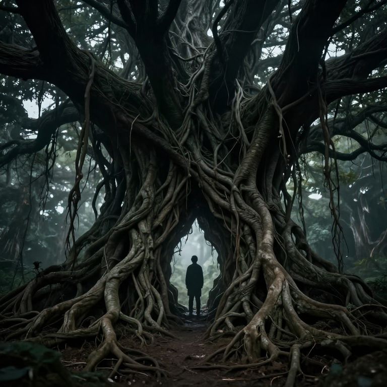 Photograph of a mystical forest scene featuring an enormous, ancient tree with massive, twisted roots forming a natural archway. A lone silhouette of a person stands in the center of the archway, gazing into the misty distance. The tree's dark, gnarled bark contrasts with the soft, diffused light filtering through the dense canopy. The background is shrouded in fog, adding a sense of mystery and depth. The overall color palette is dark and moody, with deep greens and grays. The image evokes a sense of awe and wonder.