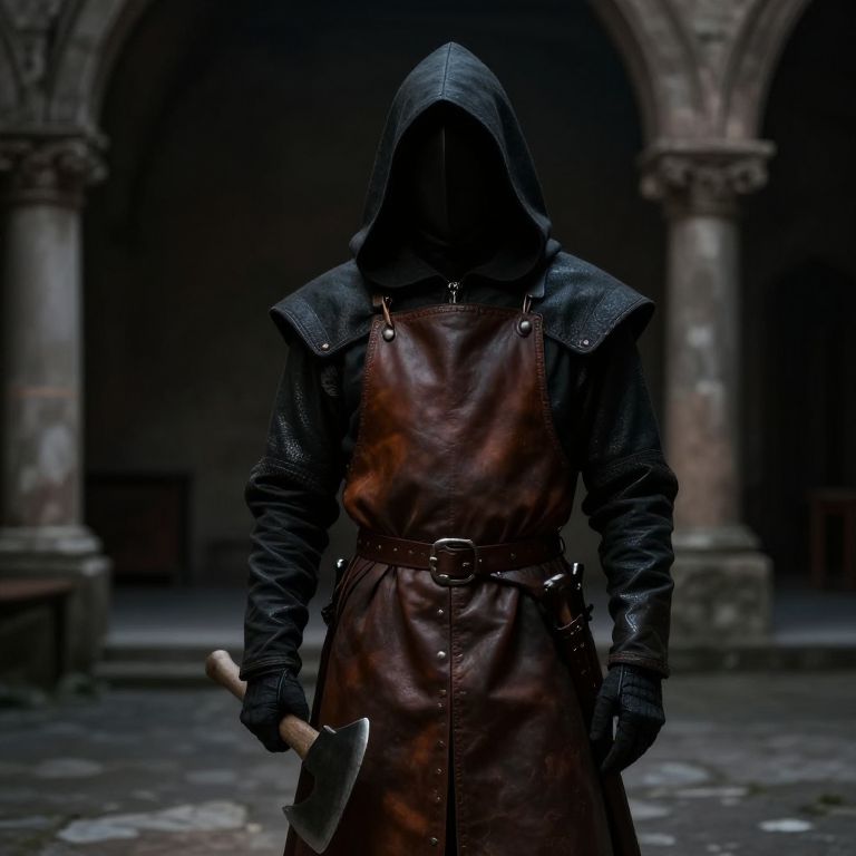 Renaissance executioner standing solemnly in dimly lit medieval courtyard, wearing dark hood and leather apron, holding a large axe, detailed textures, moody atmosphere