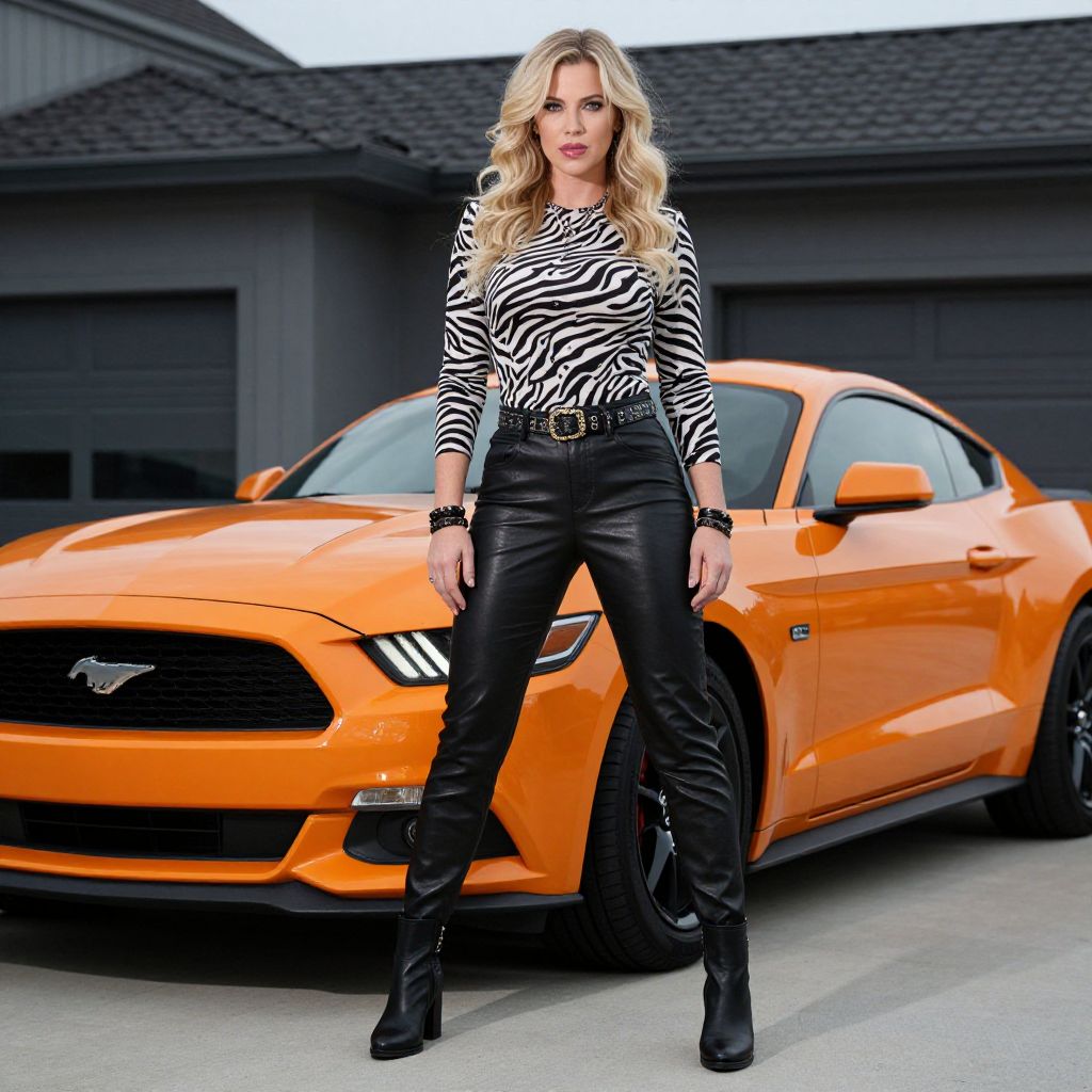 Photograph of a blonde woman with wavy hair, wearing a zebra-print top and black leather pants, standing confidently in front of an orange Ford Mustang. She's accessorized with a belt, bracelets, and black ankle boots. The car's sleek, shiny exterior contrasts with her outfit. The background shows a gray building with a dark roof. The overall vibe is stylish and bold.