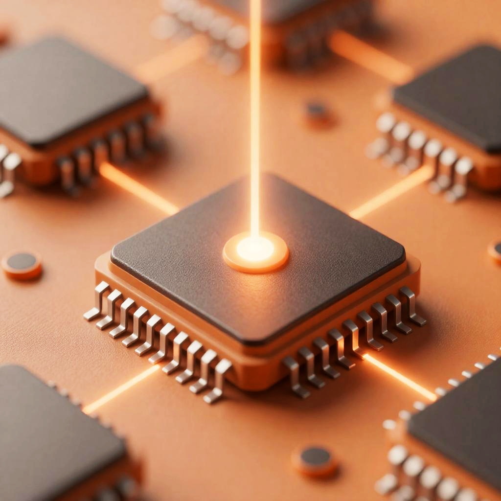 Orange tone, computer chip, product closeups, photography closeups, cinematic rendering, C4D, blender, 3D, ultra-high definition texture details, resistors, Special Effects, (Luminous line converging towards the middle:1.2)