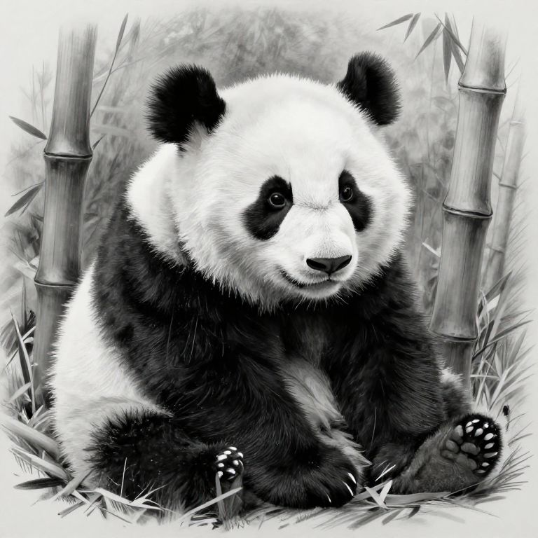 Cute animal drawings realistic scenes highlighting a baby panda sitting calmly, intricate black and white fur patterns, charcoal and graphite sketch style, surrounded by bamboo stalks, with fine texture and gentle highlights to bring natural softness and realism to the image.