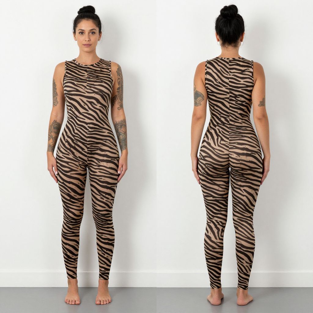 Photograph of a woman with dark hair in a bun, standing against a white wall. She's wearing a full-body zebra print body suit, revealing her tattoos on arms and legs. The suit covers her completely from chest to toes, with black stripes on a beige background. Front and back views are shown side by side, highlighting her slim build and bare feet on a gray floor.