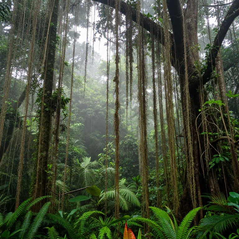 A panoramic view of a dense rainforest with countless lianas hanging and wrapping around tall trees, foggy ambiance with soft diffused light, illustrating the diverse ecosystem where lianas play a critical role, highlighting vibrant plants and majestic natural growth.