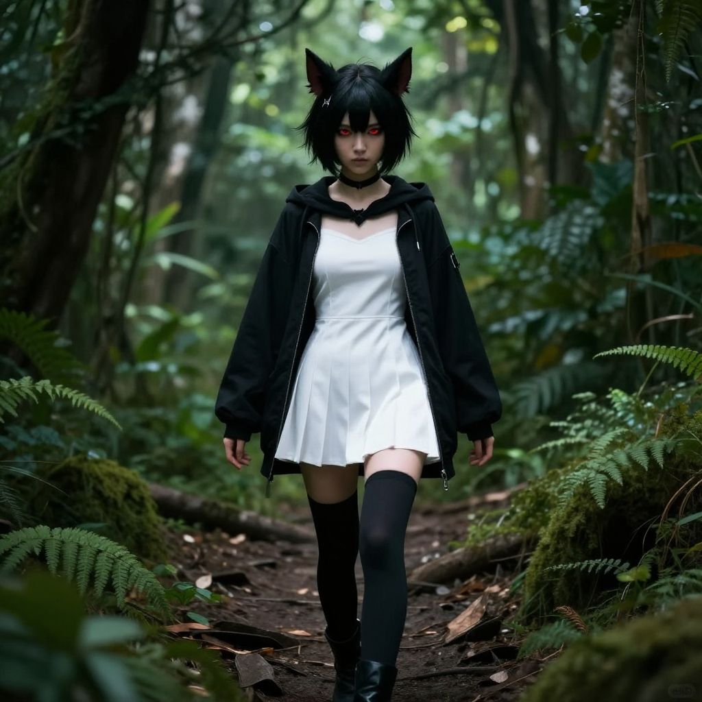A digital artwork depicts a gothic-style woman with black cat ears and short, messy black hair, standing in a dense, green forest path. She wears a white, sleeveless, knee-length dress under a black, unzipped jacket, and black thigh-high socks with black boots. Her pale skin contrasts with her dark attire and the lush forest background. The path is lined with ferns and moss, with dappled sunlight filtering through the trees. The woman's expression is serious, and she gazes directly at the viewer. The overall atmosphere is mysterious and slightly eerie.