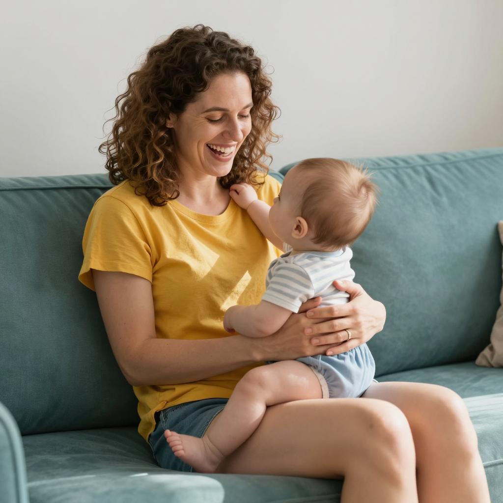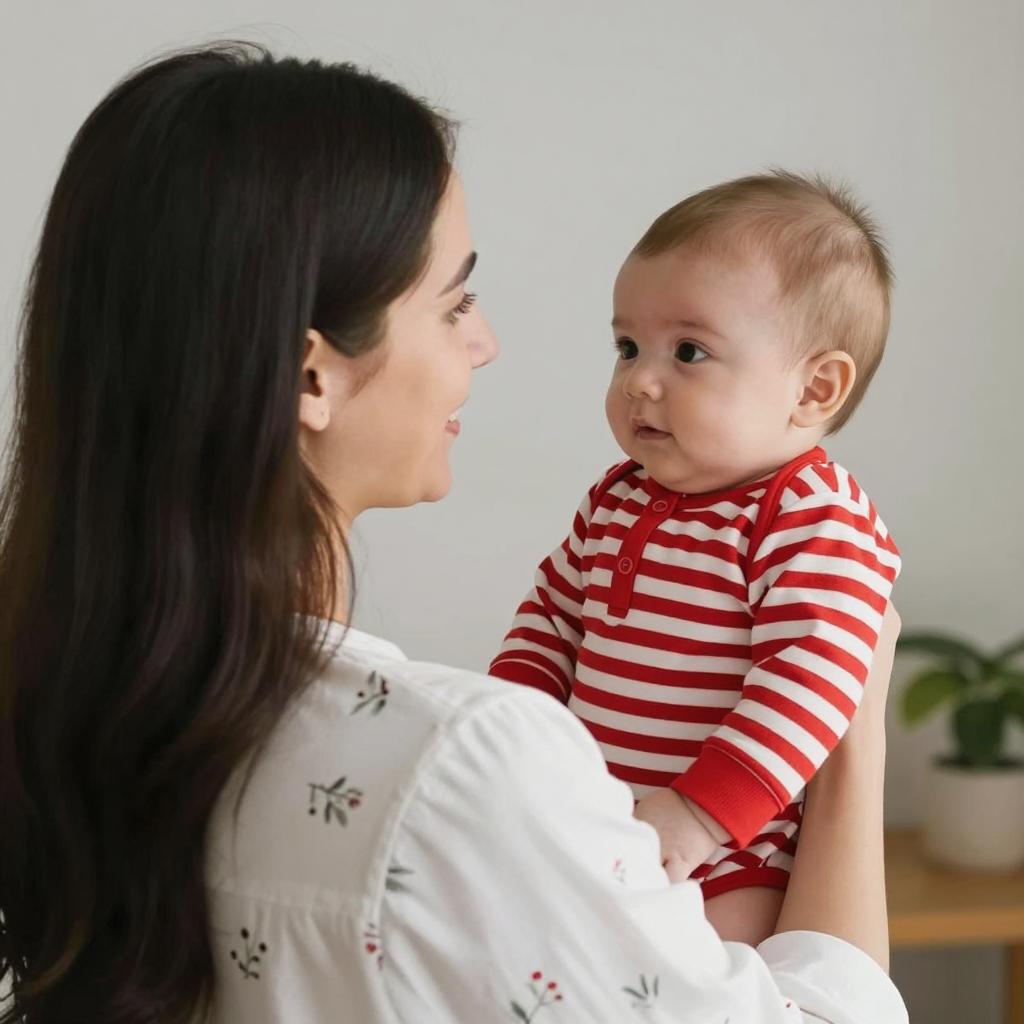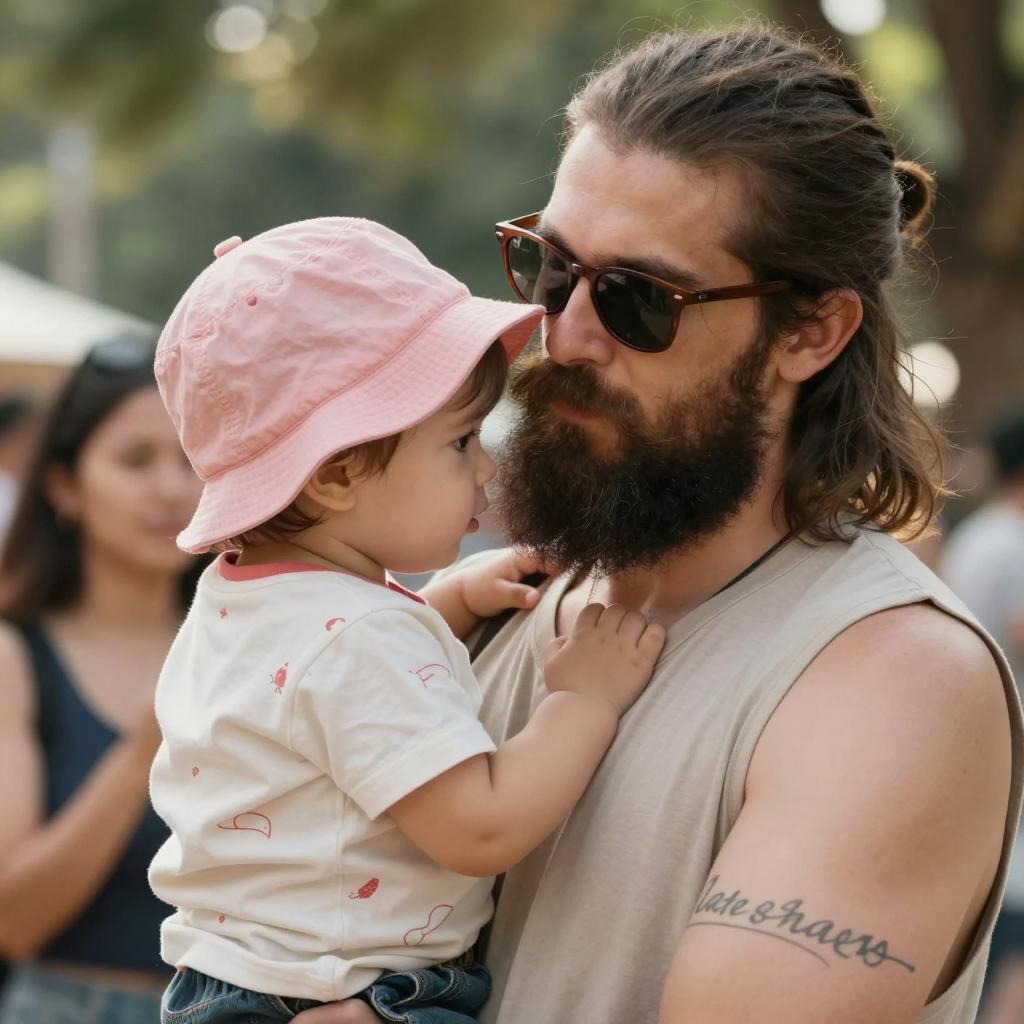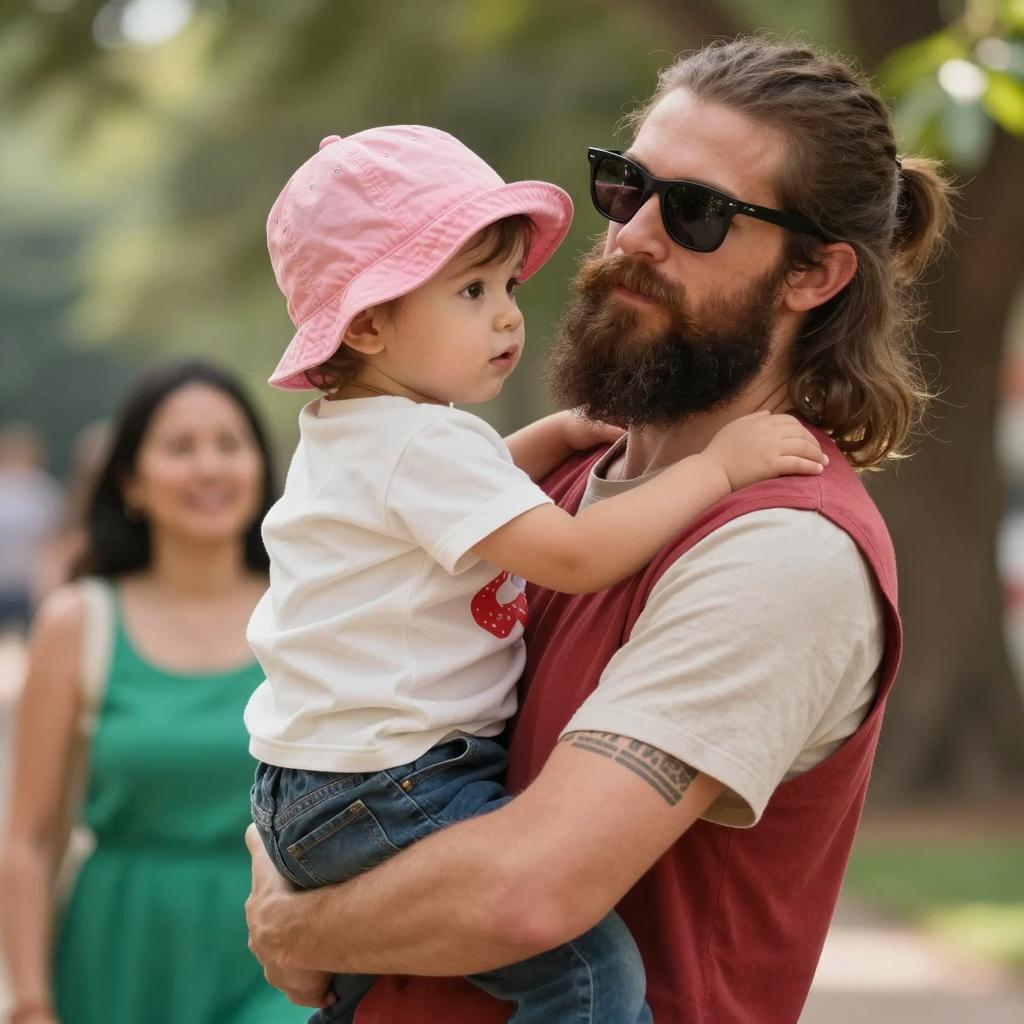 A bearded man with long hair, wearing dark sunglasses and a beige sleeveless shirt, holding a young child with a pink hat and white shirt with red patterns. The child's face is pressed against the man's chest. A woman with dark hair, wearing a sleeveless top, is blurred in the background. Sunlight filters through green trees. The man has a tattoo on his right arm.
