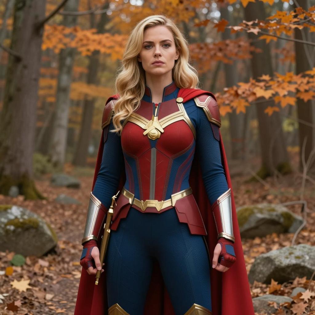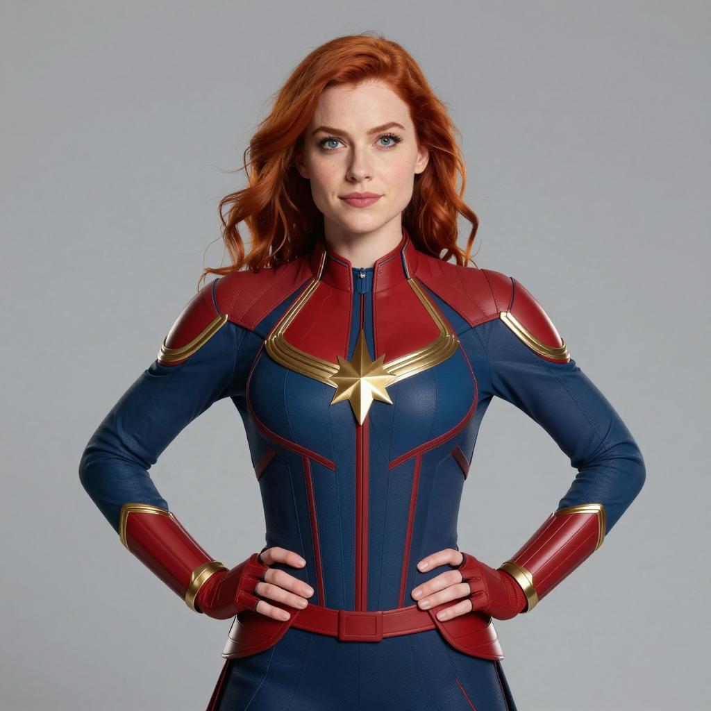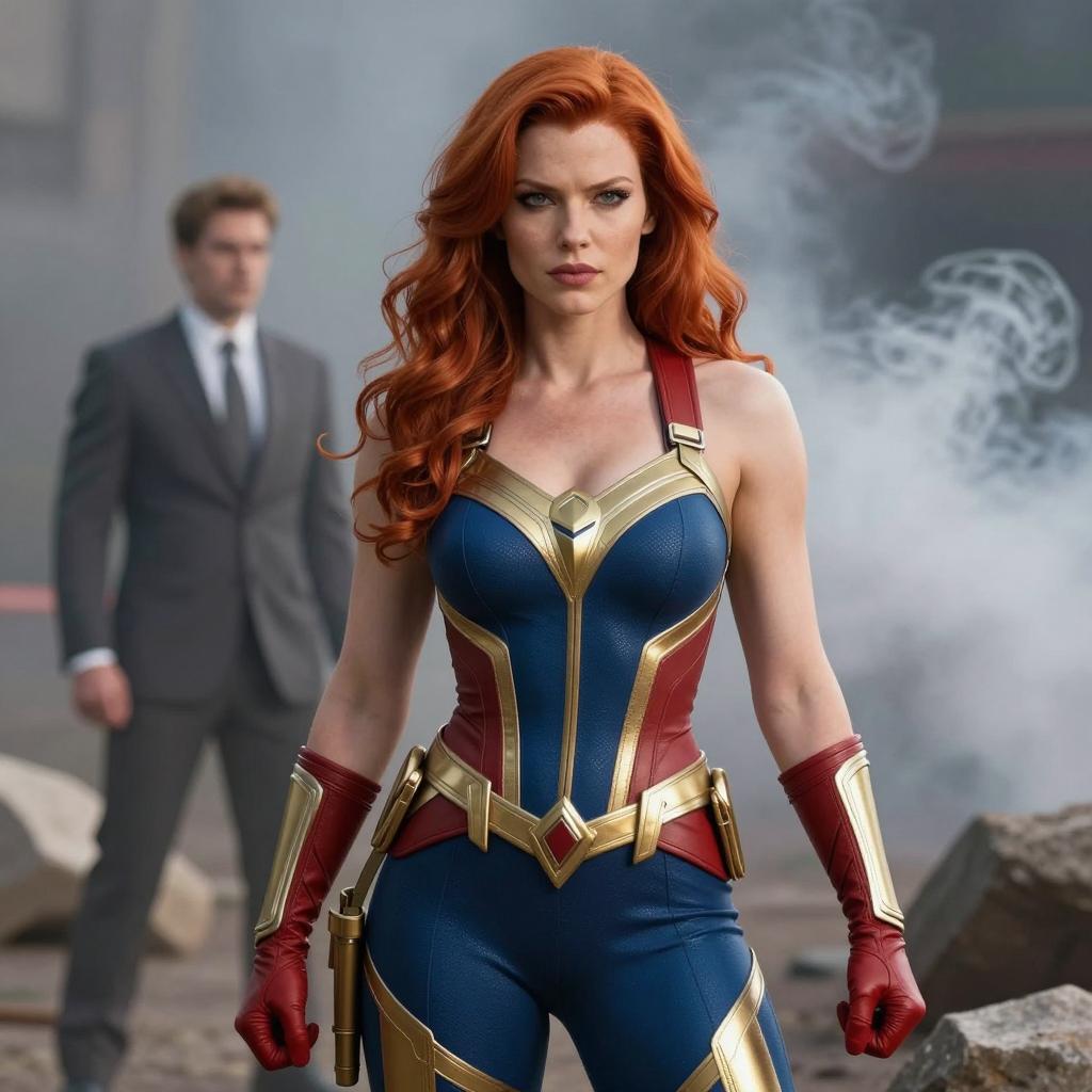 Female super hero suits, photorealistic, digital art, Marvel's Jessica Drew, Spider-Woman, standing in city street at night, detailed blue and red suit with star emblem, tight fit, long wavy red hair, serious expression, realistic lighting, blurry city background, realistic ures, high contrast, detailed shadows, urban setting, CGI, superhero, realistic skin ure, athletic physique, realistic fabric detail, gloves, belt, modern cityscape