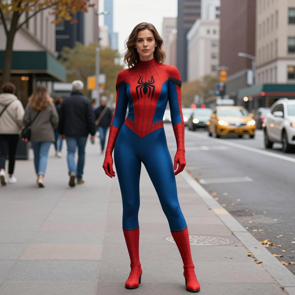 Photorealistic digital art showcasing a female superhero resembling Marvel's Jessica Drew, Spider-Woman, standing confidently in an urban city street. She wears a tight-fitting, detailed blue and red suit with a prominent gold spider emblem on the chest, complemented by matching gloves and a utility belt. Her long, wavy red hair and serious expression are highlighted by realistic lighting and shadows in a nighttime cityscape with blurred background elements.