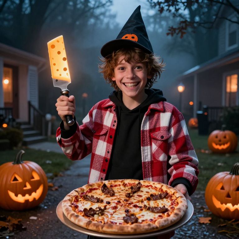 A funny boy with a wide grin and messy brown hair dressed as a haunted pizza, standing in a dimly lit Halloween neighborhood with jack-o'-lanterns and foggy trees in the background, holding a glowing cheese knife like a weapon, wearing a crooked cap and a red-and-white plaid jacket.