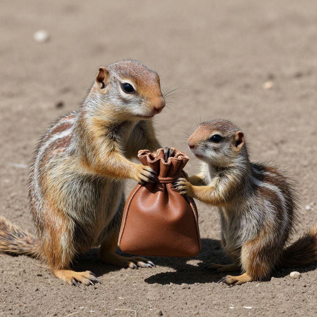 Two ground squirrels, one adult and one juvenile, sit together on earthy soil, intently holding a brown leather pouch with a drawstring closure, symbolizing the exchange of time and memories.