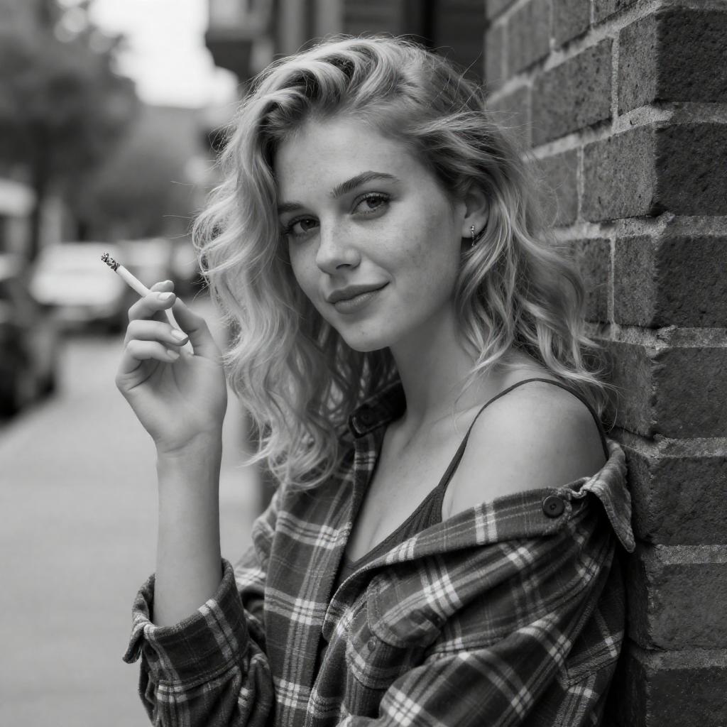 Black-and-white photograph of a young woman with wavy blonde hair, light skin, and freckles, leaning against a brick wall. She holds a cigarette in her right hand, wearing a plaid shirt with one shoulder strap visible. Background includes a blurred urban street with trees. Her face has a subtle, relaxed smile.