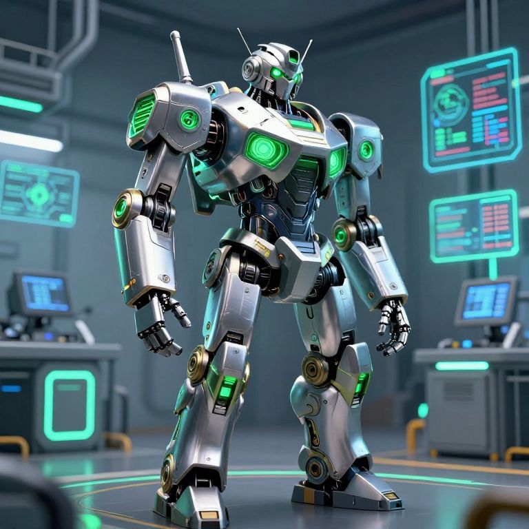 Futuristic Green Robot with Orange Eyes