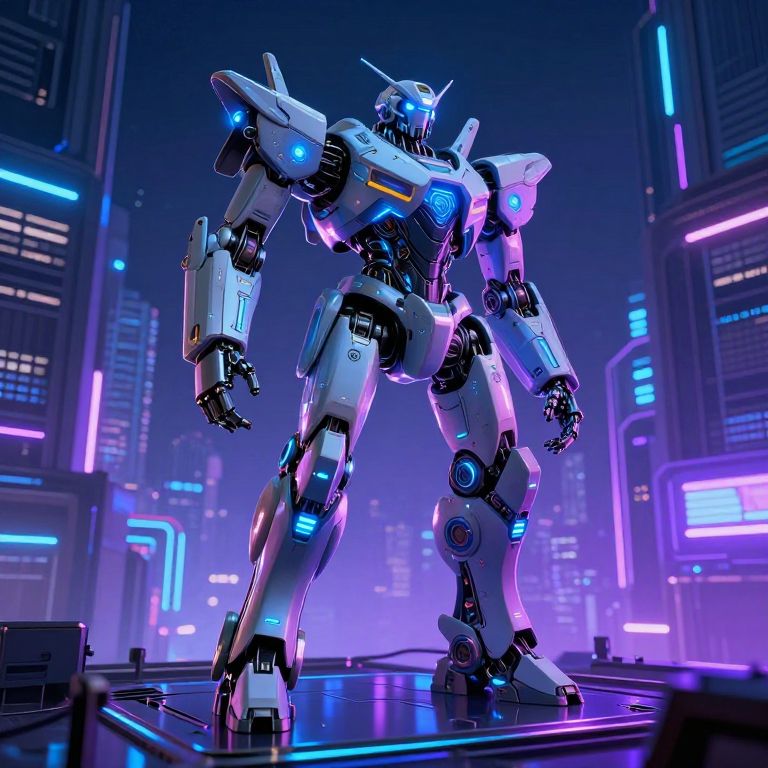 ASCIIscore_9, score_8_up, score_7_up, the image depicts a scene from a video game, featuring a robot character. the style of the artwork leans towards a highly detailed and realistic representation. the robot is prominently displayed in the foreground, standing upright with its body oriented towards the viewer. it has a predominantly green body and sports orange glowing eyes that add to its futuristic appearance., the image features a futuristic robot standing in a dark, neon lit environment. the robot has a sleek design with a green body and a black head adorned with orange eyes. it stands upright, exuding an air of strength and advanced technology.