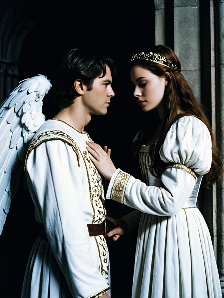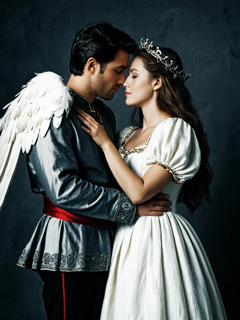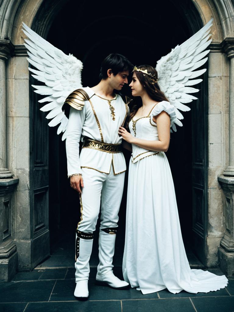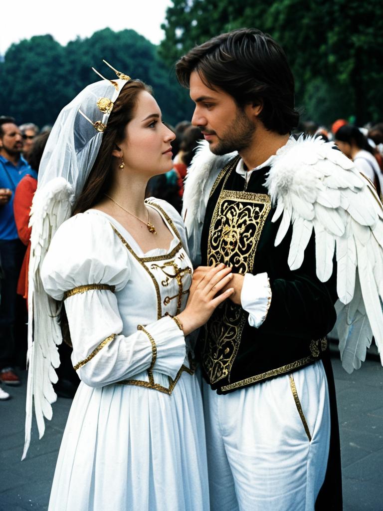 Couple in Romeo and Juliet Angel Costumes, cinematic realism, dramatic editorial photo