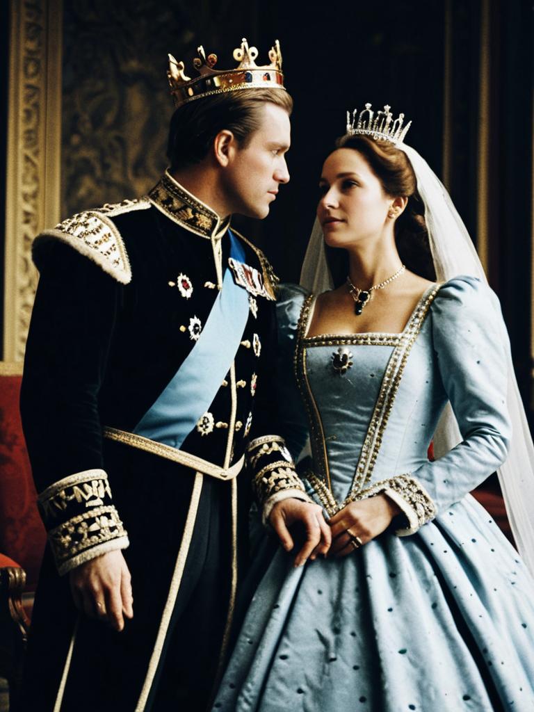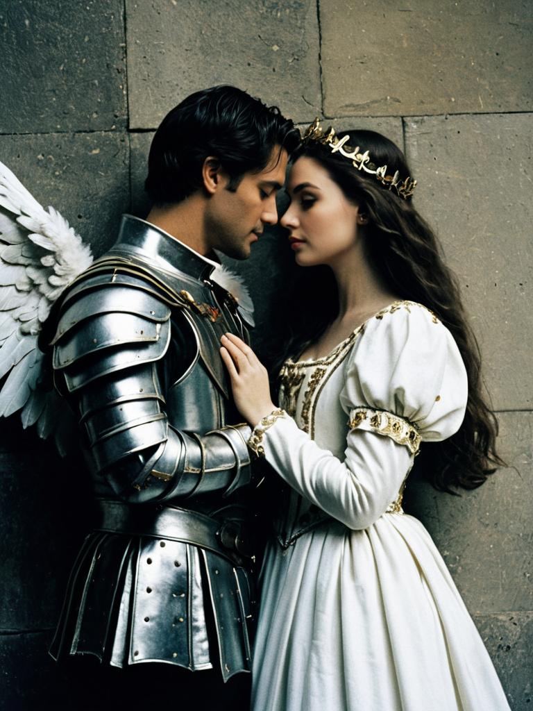 A romantic couple dressed in cinematic realism costumes inspired by Romeo and Juliet. The man is wearing medieval knight armor with metallic wings attached, while the woman wears a white medieval-style gown with gold embroidery and a gold leaf crown. They stand closely together against a stone wall, evoking a dramatic, editorial photo vibe.