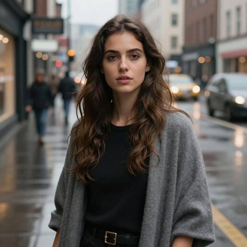 Photograph of a young woman with long, wavy brown hair and dark eyebrows, standing on a rainy urban street. She has a serious expression and wears a black top with a loose, gray cardigan over it, and a black belt with a silver buckle. The background shows a blurred, wet street with bokeh lights from storefronts, pedestrians, and parked cars. The street and buildings have a mix of red, white, and beige colors. The overall mood is somber and moody, enhanced by the overcast sky and wet pavement. The woman is centered in the frame, with a shallow depth of field focusing on her.