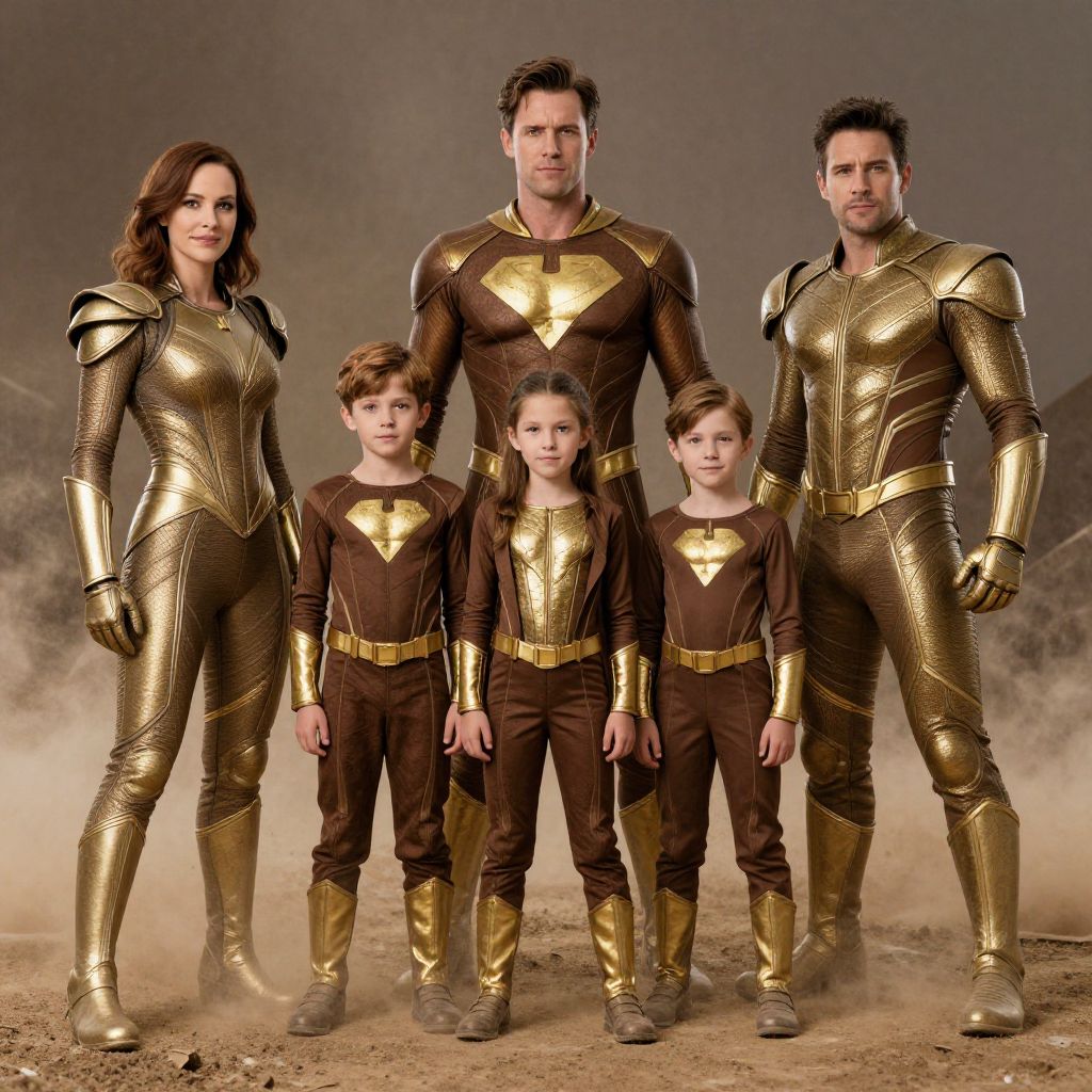Dust Superhero family photo, all are wearing brown and gold costumes, detailed, epic, dramatic lighting, award-winning photography,