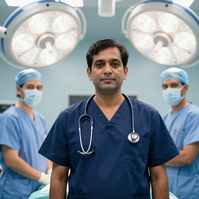 Photograph of an Indian male doctor with short black hair, medium build, and medium brown skin, standing in a brightly lit surgical room. He is wearing dark blue surgical scrubs with a stethoscope around his neck, and the doctor's face is slightly serious. In the background, two other male doctors, wearing light blue surgical scrubs and blue surgical caps, are blurred, working at a surgical table. The room features two large, circular overhead surgical lights. The overall atmosphere is clinical and professional.