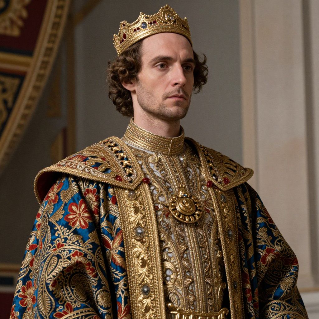 Photograph of a fair-skinned man with curly brown hair and a serious expression, wearing an ornate, gold-embellished crown and a richly decorated, royal robe with intricate floral patterns in red, blue, and gold. The robe features elaborate gold embroidery and a high, ornate collar. He is standing in a grand, historical setting with a large, arched window in the background, partially visible on the left. The lighting is soft, highlighting the textures and details of his regal attire. The overall style is reminiscent of medieval or Renaissance royal fashion.