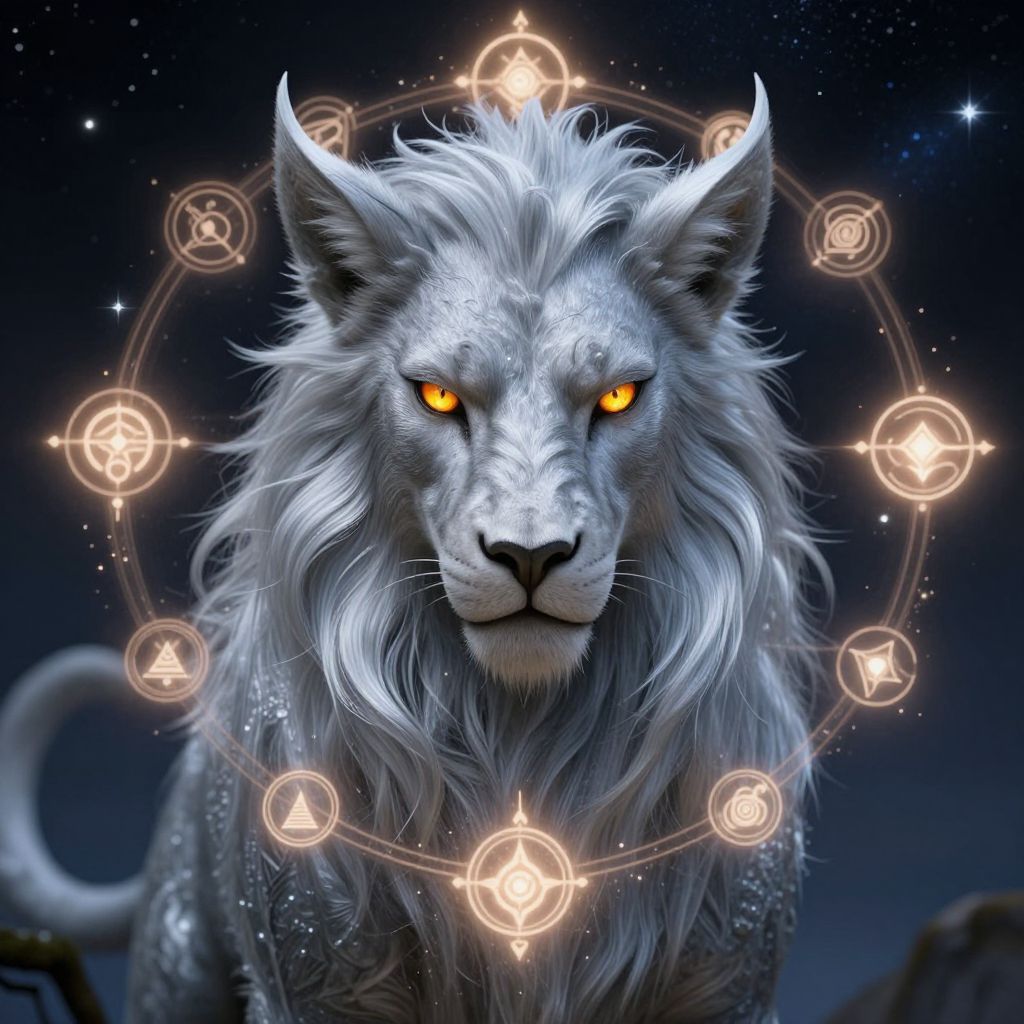 Digital artwork of a majestic, white-furred lion with glowing, intense yellow eyes, set against a dark, starry night sky. The lion's mane is detailed with shimmering highlights, and it stands with a powerful, regal presence. Surrounding the lion's head is a circular, glowing halo of magical symbols, including runes, stars, and mystical icons, all illuminated in a warm, golden light. The background features a gradient from deep blue to black, enhancing the celestial and magical atmosphere. The image combines fantasy and realism, creating a striking and otherworldly visual.