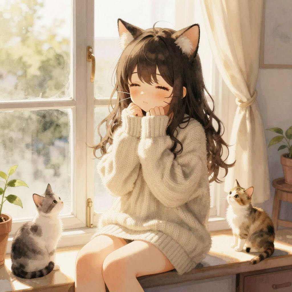 Digital anime-style drawing of a cute, long-haired girl with cat ears, wearing a cozy beige sweater, sitting by sunlit window, surrounded by three