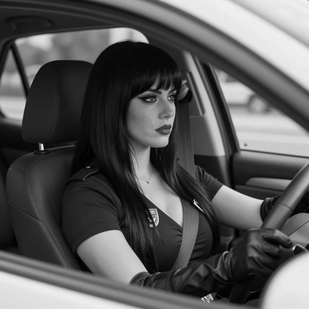 Black-and-white photograph of a woman with long black hair and bangs, wearing a dark top with a deep neckline, black gloves, and a badge on her chest. She is driving a car, gripping the steering wheel with her right hand, looking ahead with a serious expression. The car's interior is visible, with windows showing a blurred outdoor scene. She wears dark lipstick and has heavy eyeliner.