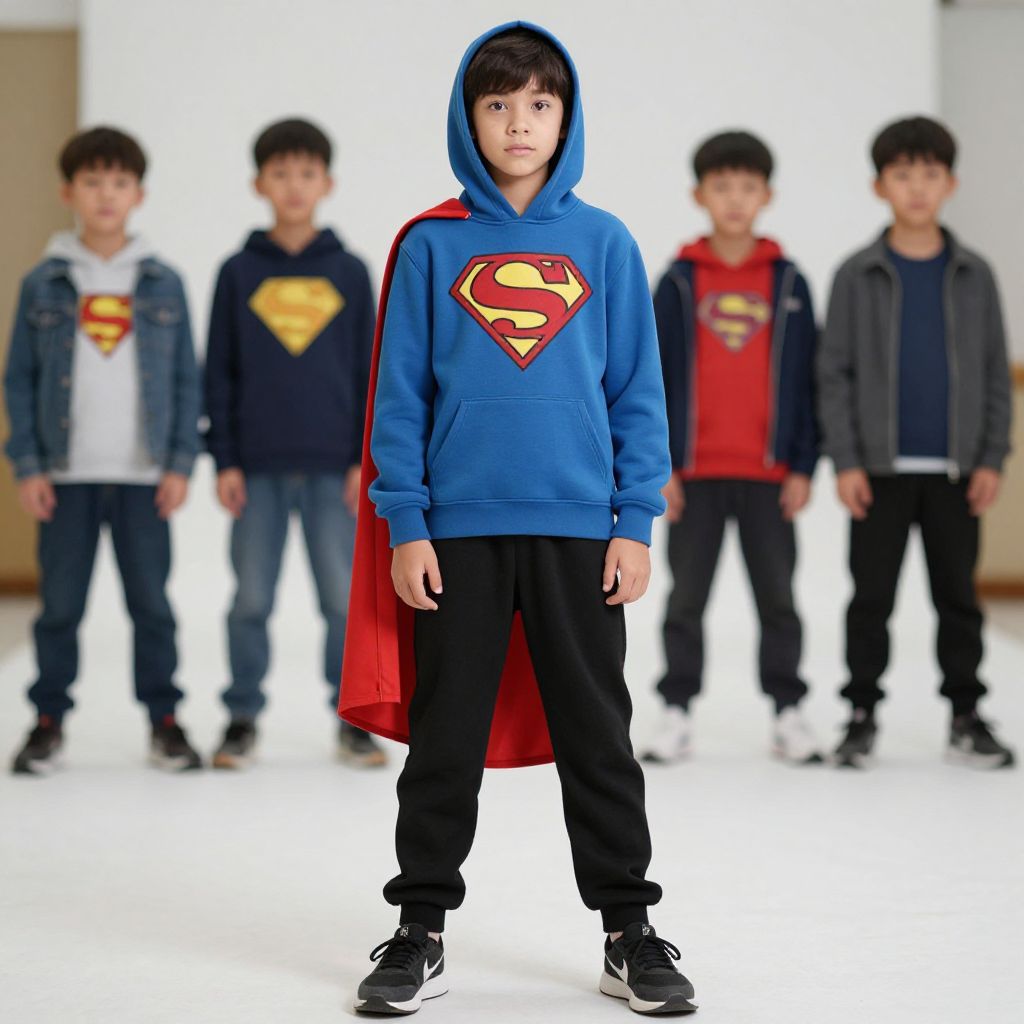 Photograph of a young Asian boy standing in the center, wearing a blue hoodie with a Superman logo, a red cape draped over his shoulders, black pants, and black sneakers. He has straight black hair and a neutral expression. Behind him, four older boys are blurred, wearing casual clothes: one with a Superman shirt, one with a red Superman shirt, one in a gray hoodie, and one in a denim jacket. The background is a bright, white, indoor space with a slightly blurred, plain wall.