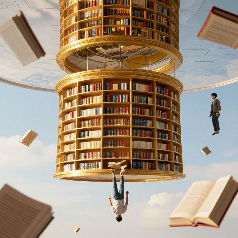 Photograph of a surreal scene featuring a large, cylindrical, golden bookshelf structure floating in a bright blue sky with scattered white clouds. Two men are suspended mid-air beneath the bookshelf; one hangs upside down from the bottom, wearing a blue shirt and gray pants, while the other floats to the right, dressed in a brown jacket and blue jeans. Several open books are flying around the scene, adding a sense of motion. The bookshelf has multiple shelves filled with colorful books, and its surface is smooth and reflective. The image has a whimsical, dreamlike quality.
