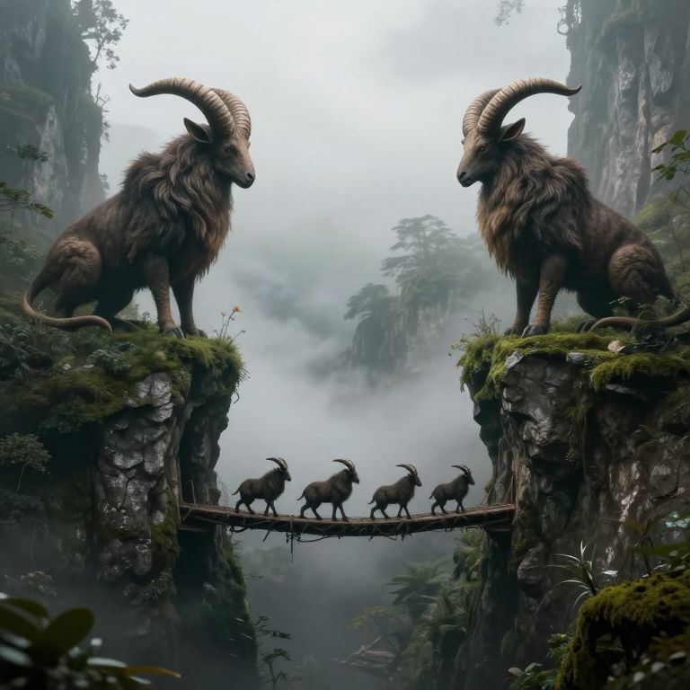 Digital fantasy artwork of two large, horned goats sitting on mossy cliffs, with four smaller goats crossing a narrow wooden bridge between them in a mist
